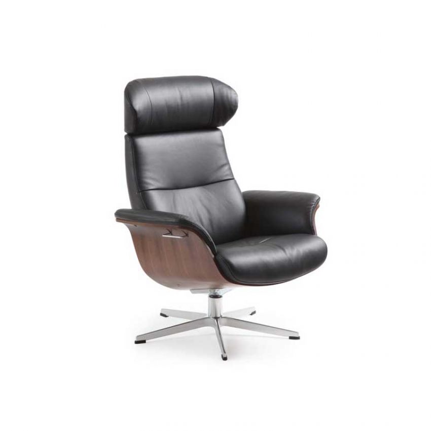 Time Out is een retromodel naar ontwerp van Jan Aamodt voor het bekende merk Conform. Deze comfortabele fauteuil met hoge rug is uitgevoerd in een combinatie van zwart leder, noten fineer en een aluminium onderstel.