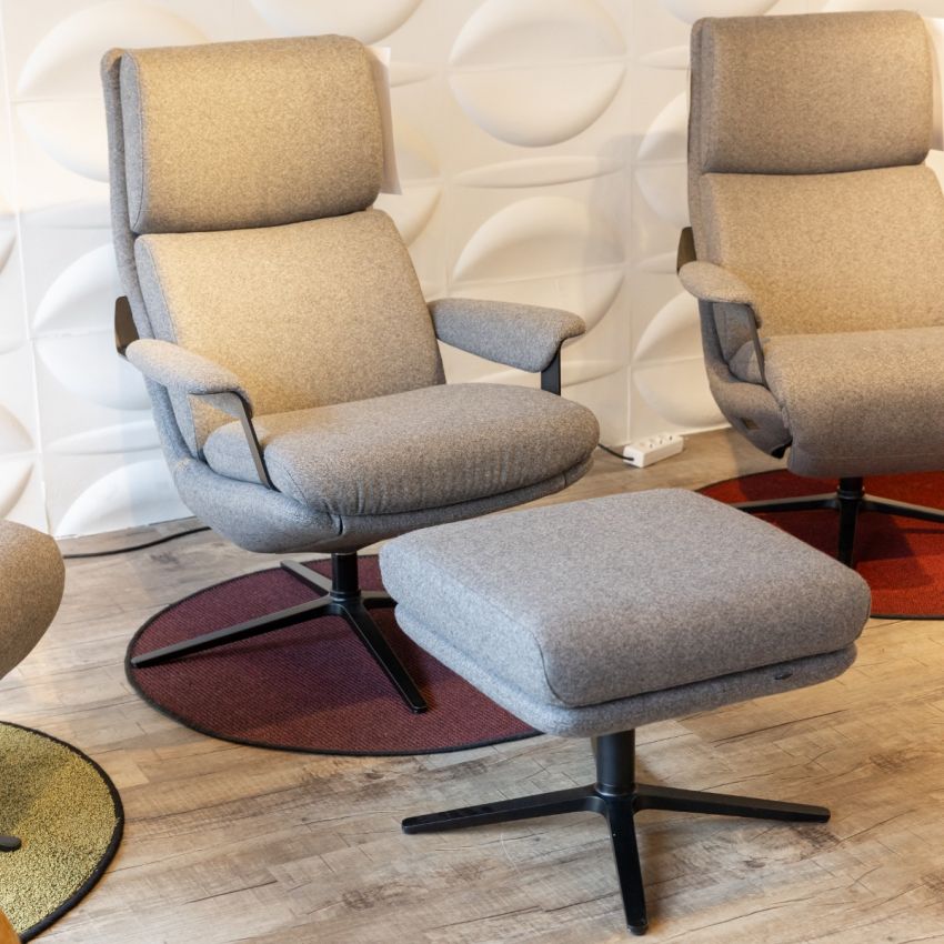 Fauteuil & hocker Vera is bekleed met Onyx 95 stof en rust op een strak zwart onderstel. De Curve-uitvoering met hoge rugleuning en 360° draaifunctie garandeert dynamische vrijheid en ergonomisch zitcomfort. Met een zithoogte van 50 cm en zitdiepte van 57 cm biedt deze set gebalanceerde ondersteuning, terwijl de bijpassende hocker extra ontspanning toevoegt. Met hoogwaardige afwerking en subtiele lijnen benadrukt de set haar moderne karakter in elk interieur.