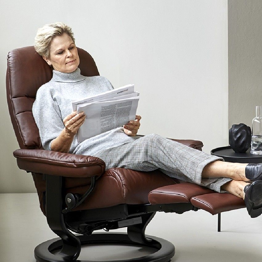 Fauteuil Sunrise is een klassiek ontwerp van het merk Stressless®. Deze uitvoering beschikt over een uitklapbare voetensteun, precies voor de momenten dat u extra comfort wenst.